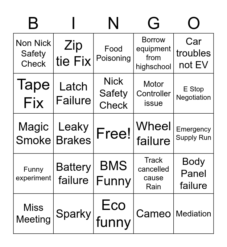 This bingo card has a free space and 24 words: Battery failure, Sparky, Nick Safety Check, Miss Meeting, Car troubles not EV, Non Nick Safety Check, Tape Fix, Zip tie Fix, Wheel failure, BMS Funny, Motor Controller issue, Magic Smoke, Track cancelled cause Rain, Body Panel failure, Latch Failure, Cameo, Emergency Supply Run, Food Poisoning, E Stop Negotiation, Leaky Brakes, Mediation, Funny experiment, Borrow equipment from highschool and Eco funny.