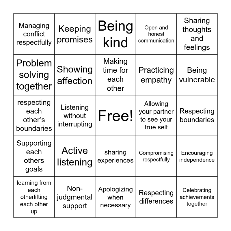 This bingo card has a free space and 32 words: Respecting differences, Patience, Listening without interrupting, Being trustworthy, Supporting each others goals, Showing affection, Sharing thoughts and feelings, Encouraging independence, Keeping promises, Being understanding, Making time for each other, Being kind, Ensuring that your words show understanding and care, Forgiving mistakes and letting go of past grievances, Allowing your partner to see your true self, Offering support through both good and bad times, learning from each otherlifting each other up, respecting each other’s boundaries, sharing experiences, Active listening, Compromising respectfully, Expressing appreciation, Respecting boundaries, Non-judgmental support, Celebrating achievements together, Open and honest communication, Practicing empathy, Problem solving together, Managing conflict respectfully, Apologizing when necessary, Quality time together and Being vulnerable.