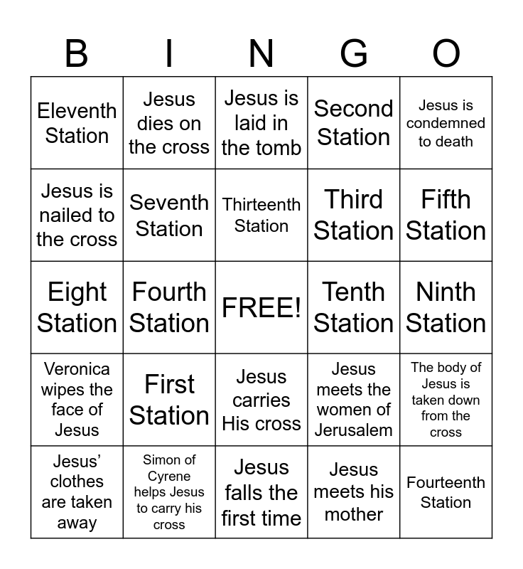 This bingo card has a free space and 24 words: First Station, Simon of Cyrene helps Jesus to carry his cross, Thirteenth Station, Jesus’ clothes are taken away, Jesus is condemned to death, Eleventh Station, Jesus is nailed to the cross, Jesus dies on the cross, Tenth Station, Jesus carries His cross, Third Station, Eight Station, Jesus meets the women of Jerusalem, The body of Jesus is taken down from the cross, Seventh Station, Jesus meets his mother, Ninth Station, Jesus is laid in the tomb, Fifth Station, Fourth Station, Fourteenth Station, Veronica wipes the face of Jesus, Second Station and Jesus falls the first time.