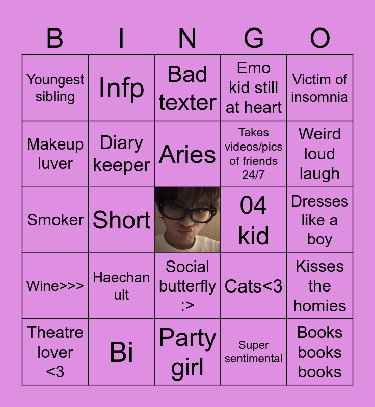 This bingo card has a free space and 24 words: Haechan ult, Bi, Aries, Theatre lover <3, Victim of insomnia, Youngest sibling, Makeup luver, Infp, 04 kid, Social butterfly :>, Takes videos/pics of friends 24/7, Smoker, Cats<3, Kisses the homies, Diary keeper, Super sentimental, Dresses like a boy, Bad texter, Weird loud laugh, Short, Books books books, Wine>>>, Emo kid still at heart and Party girl.