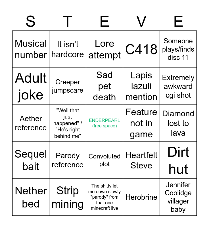 This bingo card has a free space and 24 words: Parody reference, Strip mining, Sad pet death, Nether bed, Someone plays/finds disc 11, Musical number, Adult joke, It isn't hardcore, Feature not in game, Convoluted plot, Lapis lazuli mention, Aether reference, Heartfelt Steve, Dirt hut, Creeper jumpscare, Herobrine, Diamond lost to lava, Lore attempt, Extremely awkward cgi shot, "Well that just happened" / "He's right behind me", Jennifer Coolidge villager baby, Sequel bait, C418 and The shitty let me down slowly "parody" from that one minecraft live.