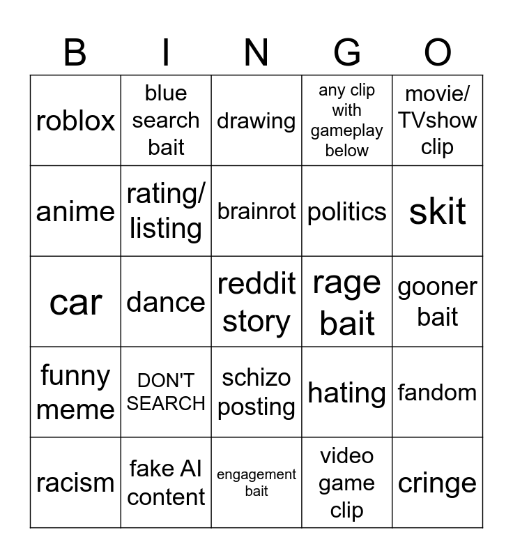 This bingo card has 25 words: DON'T SEARCH, engagement bait, brainrot, racism, movie/ TVshow clip, roblox, anime, blue search bait, rage bait, schizo posting, politics, car, hating, fandom, rating/ listing, cringe, gooner bait, drawing, skit, dance, reddit story, fake AI content, funny meme, any clip with gameplay below and video game clip.