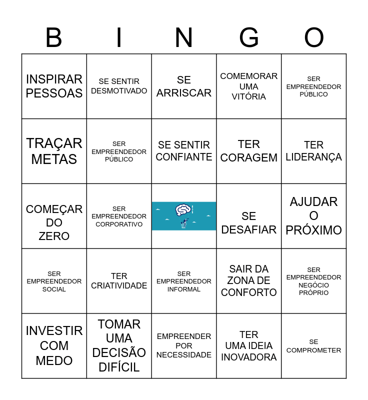 This bingo card has a free space and 28 words: SER EMPREENDEDOR NEGÓCIO PRÓPRIO, ALGUÉM NÃO ACREDITAR EM VOCÊ, TER CORAGEM, TER UMA IDEIA INOVADORA, TRAÇAR METAS, SE ARRISCAR, SE SENTIR DESMOTIVADO, SER EMPREENDEDOR SOCIAL, SE DESAFIAR, INVESTIR COM MEDO, COMEÇAR DO ZERO, COMEMORAR UMA VITÓRIA, TOMAR UMA DECISÃO DIFÍCIL, EMPREENDER POR NECESSIDADE, TER LIDERANÇA, EMPREENDER POR OPORTUNIDADE, TER CRIATIVIDADE, SER EMPREENDEDOR PÚBLICO, SE SENTIR CONFIANTE, SER EMPREENDEDOR INFORMAL, INSPIRAR PESSOAS, PERSEVERAR, SE COMPROMETER, SER EMPREENDEDOR CORPORATIVO, AJUDAR O PRÓXIMO, SAIR DA ZONA DE CONFORTO, SER EMPREENDEDOR PÚBLICO and SUPERAR A CONCORRÊNCIA.