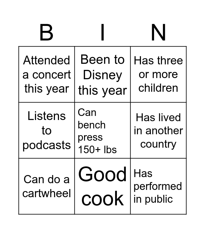 This bingo card has a free space and 8 words: Has lived in another country, Has three or more children, Been to Disney this year, Can do a cartwheel, Attended a concert this year, Has performed in public, Listens to podcasts and Good cook.