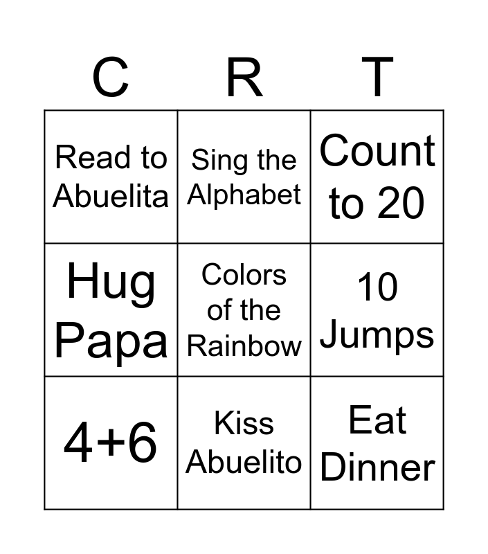 This bingo card has a free space and 8 words: 10 Jumps, Count to 20, Sing the Alphabet, 4+6, Read to Abuelita, Eat Dinner, Hug Papa and Kiss Abuelito.