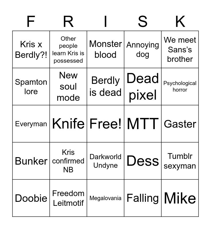 This bingo card has a free space and 24 words: Kris confirmed NB, Freedom Leitmotif, Berdly is dead, Doobie, We meet Sans’s brother, Kris x Berdly?!, Spamton lore, Other people learn Kris is possessed, MTT, Darkworld Undyne, Dead pixel, Everyman, Dess, Tumblr sexyman, New soul mode, Falling, Gaster, Monster blood, Psychological horror, Knife, Mike, Bunker, Annoying dog and Megalovania.