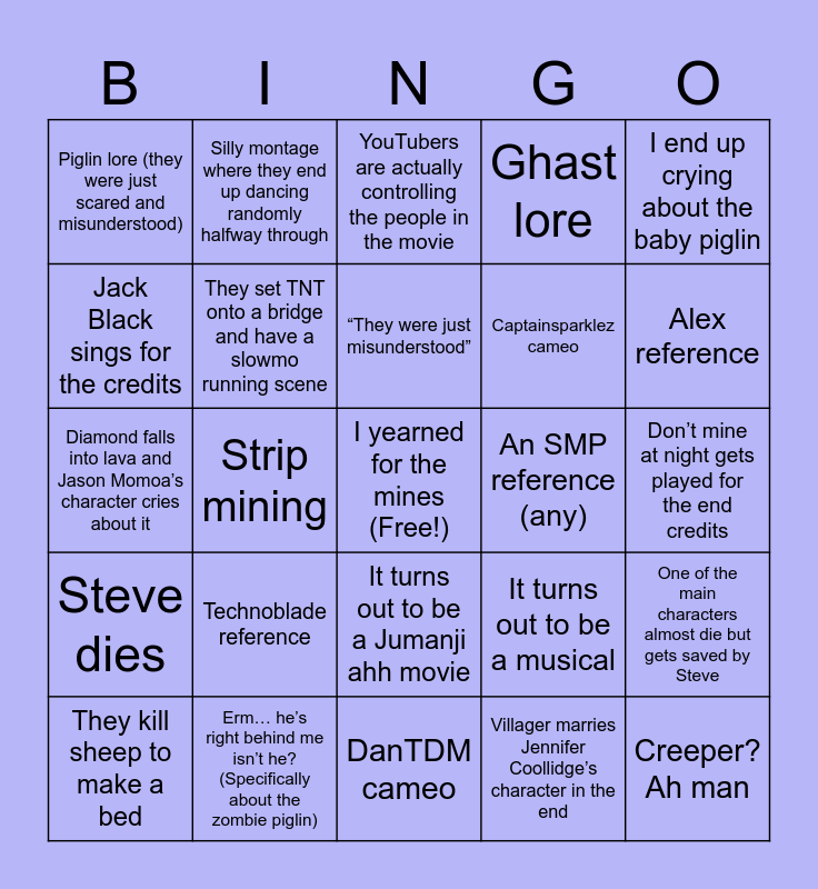 This bingo card has a free space and 24 words: Technoblade reference, Erm… he’s right behind me isn’t he? (Specifically about the zombie piglin), “They were just misunderstood”, They kill sheep to make a bed, I end up crying about the baby piglin, Piglin lore (they were just scared and misunderstood), Jack Black sings for the credits, Silly montage where they end up dancing randomly halfway through, An SMP reference (any), It turns out to be a Jumanji ahh movie, Captainsparklez cameo, Diamond falls into lava and Jason Momoa’s character cries about it, It turns out to be a musical, One of the main characters almost die but gets saved by Steve, They set TNT onto a bridge and have a slowmo running scene, Villager marries Jennifer Coollidge’s character in the end, Don’t mine at night gets played for the end credits, YouTubers are actually controlling the people in the movie, Alex reference, Strip mining, Creeper?Ah man, Steve dies, Ghast lore and DanTDM cameo.