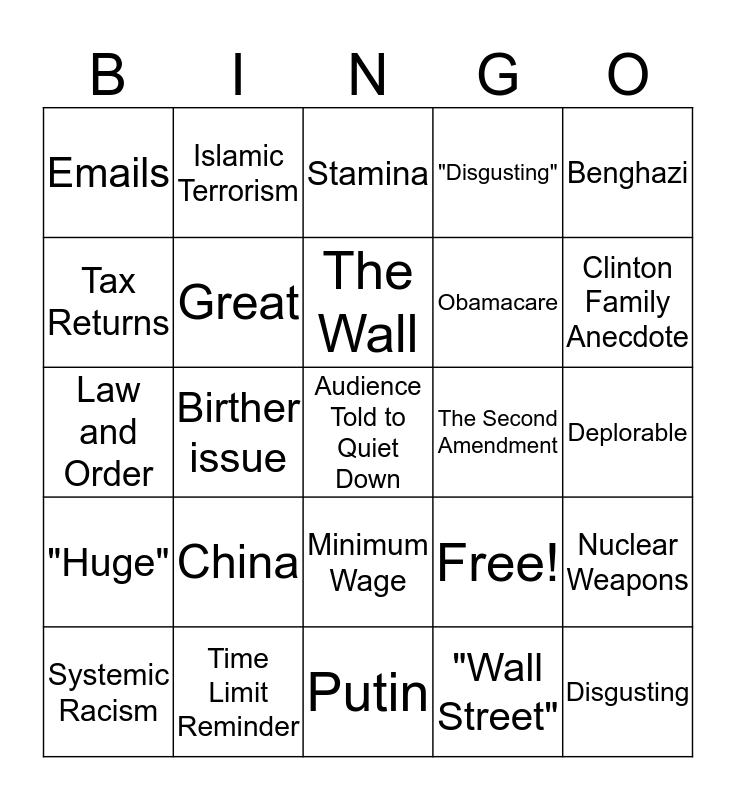This bingo card has 25 words: China, Putin, The Wall, Systemic Racism, Benghazi, Emails, Tax Returns, Islamic Terrorism, The Second Amendment, Minimum Wage, Obamacare, Law and Order, Free!, Nuclear Weapons, Great, Disgusting, Deplorable, Stamina, Clinton Family Anecdote, Birther issue, Audience Told to Quiet Down, Time Limit Reminder, "Huge", "Disgusting" and "Wall Street".