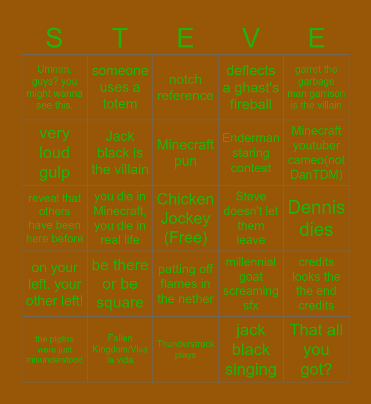This bingo card has a free space and 34 words: he's right behind me, isn't he?, jack black singing, that's gotta hurt, Minecraft youtuber reference, on your left. your other left!, Jack black is the villain, garret the garbage man garrison is the villain, the piglins were just misunderstood, someone uses a totem, Minecraft parody song in the credits, Minecraft pun, notch reference, they make Minecraft into a game at the end of the movie, big disagreement, Steve doesn't let them leave, Minecraft youtuber cameo(not DanTDM), Fallen Kingdom/Viva la vida, reveal that others have been here before, be there or be square, millennial goat screaming sfx, patting off flames in the nether, Its quiet. to quiet, Ummm, guys? you might wanna see this., Dennis dies, Thunderstruck plays, That all you got?, deflects a ghast's fireball, herobrine, Enderman staring contest, very loud gulp, frogs, you die in Minecraft, you die in real life, credits looks the the end credits and questions floating blocks.