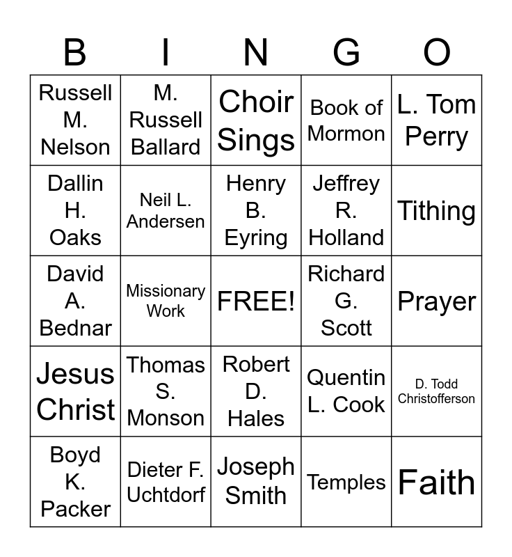 This bingo card has a free space and 24 words: Thomas S. Monson, Dieter F. Uchtdorf, Henry B. Eyring, Boyd K. Packer, L. Tom Perry, Russell M. Nelson, Dallin H. Oaks, M. Russell Ballard, Richard G. Scott, Robert D. Hales, Jeffrey R. Holland, David A. Bednar, Quentin L. Cook, D. Todd Christofferson, Neil L. Andersen, Temples, Prayer, Choir Sings, Tithing, Missionary Work, Faith, Jesus Christ, Book of Mormon and Joseph Smith.