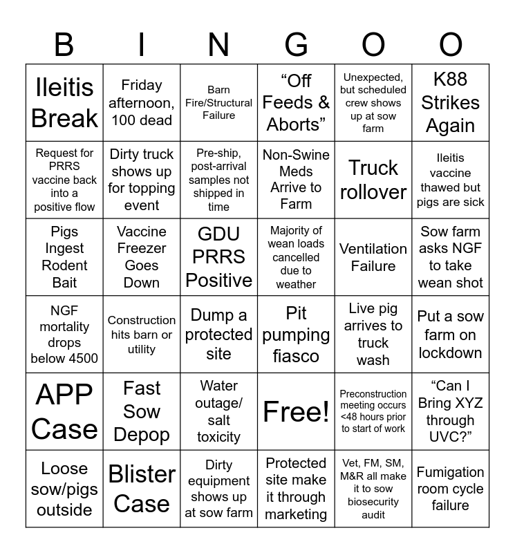 This bingo card has 36 words: Free!, Water outage/ salt toxicity, Protected site make it through marketing, Request for PRRS vaccine back into a positive flow, NGF mortality drops below 4500, Majority of wean loads cancelled due to weather, Dirty truck shows up for topping event, Dirty equipment shows up at sow farm, Unexpected, but scheduled crew shows up at sow farm, Preconstruction meeting occurs <48 hours prior to start of work, Ileitis vaccine thawed but pigs are sick, “Off Feeds & Aborts”, “Can I Bring XYZ through UVC?”, Vaccine Freezer Goes Down, Non-Swine Meds Arrive to Farm, Ileitis Break, APP Case, Ventilation Failure, Pigs Ingest Rodent Bait, Barn Fire/Structural Failure, GDU PRRS Positive, Construction hits barn or utility, Pit pumping fiasco, Dump a protected site, Live pig arrives to truck wash, Friday afternoon, 100 dead, Truck rollover, Blister Case, Pre-ship, post-arrival samples not shipped in time, K88 Strikes Again, Fumigation room cycle failure, Loose sow/pigs outside, Put a sow farm on lockdown, Sow farm asks NGF to take wean shot, Fast Sow Depop and Vet, FM, SM, M&R all make it to sow biosecurity audit.