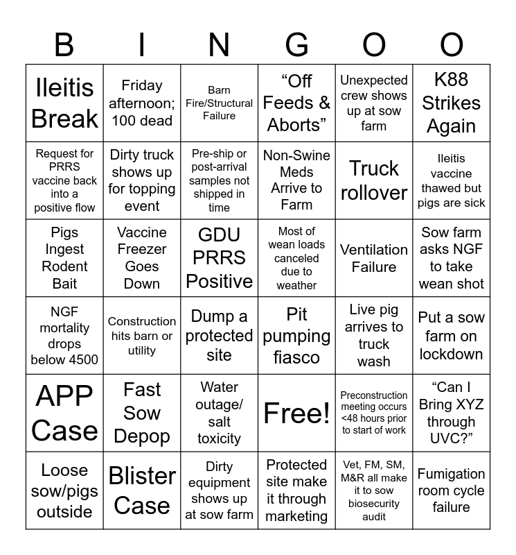 This bingo card has 36 words: Free!, Water outage/ salt toxicity, Protected site make it through marketing, Request for PRRS vaccine back into a positive flow, NGF mortality drops below 4500, Most of wean loads canceled due to weather, Dirty truck shows up for topping event, Dirty equipment shows up at sow farm, Unexpected crew shows up at sow farm, Preconstruction meeting occurs <48 hours prior to start of work, Ileitis vaccine thawed but pigs are sick, “Off Feeds & Aborts”, “Can I Bring XYZ through UVC?”, Vaccine Freezer Goes Down, Non-Swine Meds Arrive to Farm, Ileitis Break, APP Case, Ventilation Failure, Pigs Ingest Rodent Bait, Barn Fire/Structural Failure, GDU PRRS Positive, Construction hits barn or utility, Pit pumping fiasco, Dump a protected site, Live pig arrives to truck wash, Friday afternoon; 100 dead, Truck rollover, Blister Case, Pre-ship or post-arrival samples not shipped in time, K88 Strikes Again, Fumigation room cycle failure, Loose sow/pigs outside, Put a sow farm on lockdown, Sow farm asks NGF to take wean shot, Fast Sow Depop and Vet, FM, SM, M&R all make it to sow biosecurity audit.
