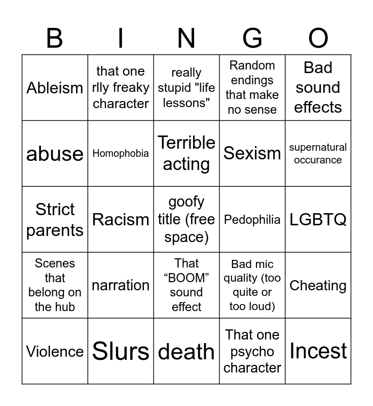 This bingo card has a free space and 24 words: narration, Slurs, Terrible acting, Violence, Bad sound effects, Ableism, abuse, that one rlly freaky character, Pedophilia, That “BOOM” sound effect, Sexism, Strict parents, Bad mic quality (too quite or too loud), Cheating, Homophobia, That one psycho character, LGBTQ, really stupid "life lessons", supernatural occurance, Racism, Incest, Scenes that belong on the hub, Random endings that make no sense and death.