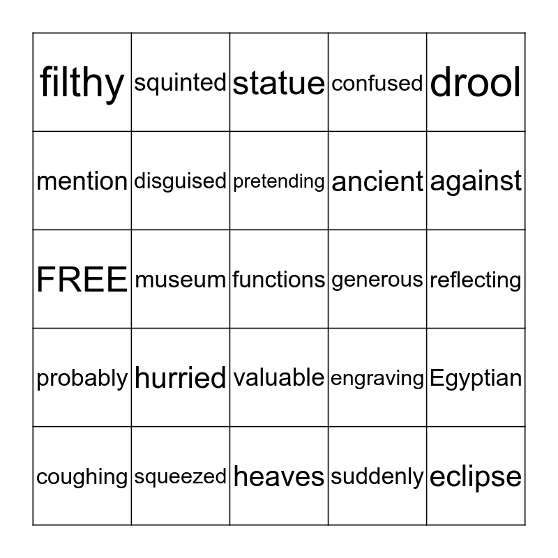 This bingo card has 25 words: hurried, heaves, pretending, coughing, drool, filthy, mention, squinted, generous, valuable, ancient, FREE, engraving, Egyptian, disguised, eclipse, reflecting, statue, against, museum, functions, squeezed, probably, confused and suddenly.