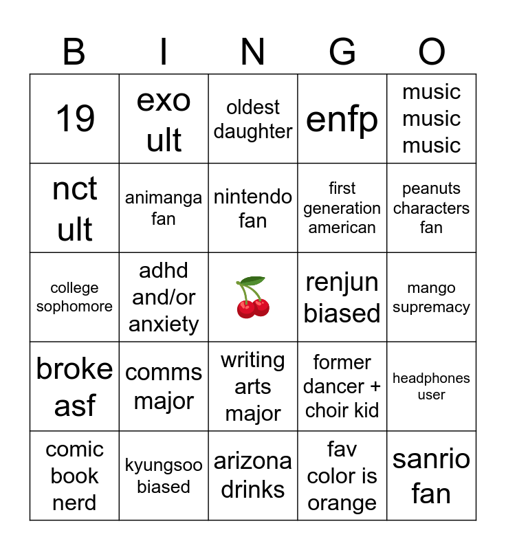 This bingo card has a free space and 24 words: comms major, kyungsoo biased, nintendo fan, comic book nerd, music music music, 19, nct ult, exo ult, renjun biased, writing arts major, first generation american, college sophomore, former dancer + choir kid, headphones user, animanga fan, fav color is orange, mango supremacy, oldest daughter, peanuts characters fan, adhd and/or anxiety, sanrio fan, broke asf, enfp and arizona drinks.