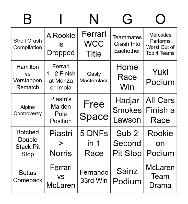 This bingo card has a free space and 24 words: Piastri > Norris, Ferrari vs McLaren, Gasly Masterclass, Bottas Comeback, Mercedes Performs Worst Out of Top 4 Teams, Stroll Crash Compilation, Hamilton vs Verstappen Rematch, A Rookie is Dropped, Hadjar Smokes Lawson, 5 DNFs in 1 Race, Home Race Win, Alpine Controversy, Sub 2 Second Pit Stop, Rookie on Podium, Ferrari 1 - 2 Finish at Monza or Imola, Sainz Podium, All Cars Finish a Race, Ferrari WCC Title, Yuki Podium, Piastri's Maiden Pole Position, McLaren Team Drama, Botched Double Stack Pit Stop, Teammates Crash Into Eachother and Fernando 33rd Win.