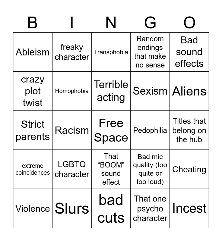 This bingo card has a free space and 24 words: LGBTQ character, Slurs, Terrible acting, Violence, Bad sound effects, Ableism, crazy plot twist, freaky character, Pedophilia, That “BOOM” sound effect, Sexism, Strict parents, Bad mic quality (too quite or too loud), Cheating, Homophobia, That one psycho character, Titles that belong on the hub, Transphobia, Aliens, Racism, Incest, extreme coincidences, Random endings that make no sense and bad cuts.