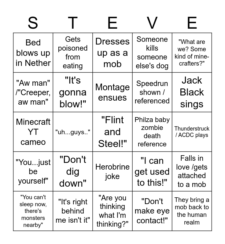 This bingo card has a free space and 24 words: "Don't dig down", "It's right behind me isn't it", Montage ensues, "You can't sleep now, there's monsters nearby", "What are we? Some kind of mine-crafters?", Bed blows up in Nether, "Aw man" /"Creeper, aw man", Gets poisoned from eating, Philza baby zombie death reference, Herobrine joke, Speedrun shown / referenced, Minecraft YT cameo, "I can get used to this!", Falls in love /gets attached to a mob, "It's gonna blow!", "Don't make eye contact!", Thunderstruck / ACDC plays, Dresses up as a mob, Jack Black sings, "uh...guys..", They bring a mob back to the human realm, "You...just be yourself", Someone kills someone else's dog and "Are you thinking what I'm thinking?".