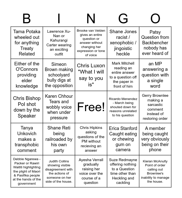 This bingo card has a free space and 39 words: Winny's Brainworm makes an unrelated Point of order, David Seymour "I hesitate to say this-" before a 10min monologue, Chloe Swarbrick threatened to be ejected for heckling., Simeon Brown making schoolyard bully digs at the opposition, Debbie Ngarewa - Packer or Rawiri Waititi highlighting the plight of Maori & Pasifika people at the hands of the government, Chris Hipkins asking questions of the PM without recieving an answer, Chris Luxon "What I will say to you is", Nicola Willis condescending personal attack, Patsy Question from Backbencher nobody has ever heard of, Tanya Unkovich makes a transphobic comment, Karen Chhour Tears and wobbly voice when under pressure, Shane Jones racist / xenophobic / jingoistic heckle, Kieran McAnulty Point of order calling out Brownlee's inability to manage the house., Gerry Brownlee making a sarcastic comment instead of restoring order, Ricardo Menendez - March being shouted down for reasons unrelated to his question, Shane Reti being railroaded by his own party, Gerry Brownlee getting someones name wrong, Tama Potaka wheeled out for anything Treaty Related, Tākuta Ferris making a comment and refusing to withdraw and apologize, Erica Stanford Caught eating or chewing gum on camera, Either of the O'Connors providing elder knowledge, Ayesha Verrall gradually raising her voice over the course of a question, Mark Mitchell reading an entire answer to a question off the paper in front of him, an MP answering a question with a single word, Cheerleading heckles from either side of the house, Apirana Ngata Mentioned, Chris Bishop having an ill fitting suit, The Speaker of the house having to remind members to be quiet on their exit from the house, Someone mixing up "Menendez-March" and "Hernandez", Lawrence Xu-Nan or Kahurangi Carter wearing an exciting outfit, Tākuta Ferris or Takutai Moana Kemp names mixed up, Casey Costello Smokers Cough during a question or answer, Brooke van Velden gives an entire question or answer without changing her expression or tone of voice, Judith Collins showing visible disagreement with the actions of someone on her side of the house., Suze Redmayne offering nothing to a Question time other than Heckling and cackling, Louise Upston mashing the invisible button on her desk while asking or answering a question, A member being caught very obviously being on their phone, Chris Bishop PoI shot down by the Speaker and Unrelated Sports or Pop culture reference in a question or answer.