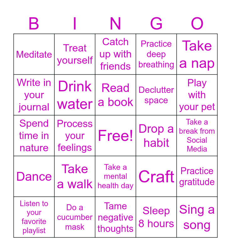 This bingo card has a free space and 24 words: Take a walk, Do a cucumber mask, Read a book, Listen to your favorite playlist, Take a nap, Meditate, Write in your journal, Treat yourself, Drop a habit, Take a mental health day, Declutter space, Spend time in nature, Craft, Practice gratitude, Drink water, Sleep 8 hours, Take a break from Social Media, Catch up with friends, Play with your pet, Process your feelings, Sing a song, Dance, Practice deep breathing and Tame negative thoughts.