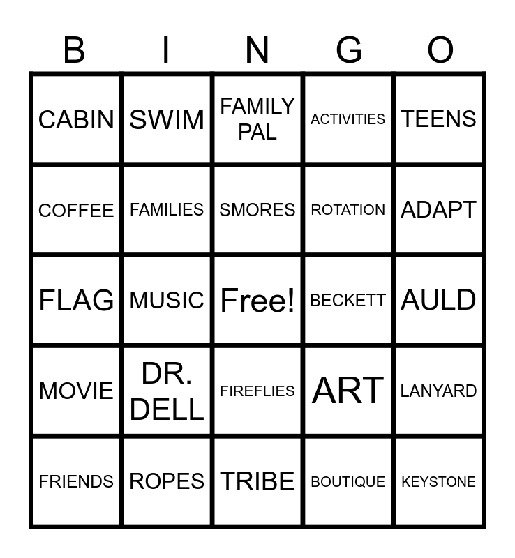 This bingo card has a free space and 24 words: DR. DELL, ROPES, SMORES, FRIENDS, TEENS, CABIN, COFFEE, SWIM, BECKETT, FIREFLIES, ROTATION, FLAG, ART, LANYARD, FAMILIES, BOUTIQUE, AULD, FAMILY PAL, ADAPT, MUSIC, KEYSTONE, MOVIE, ACTIVITIES and TRIBE.