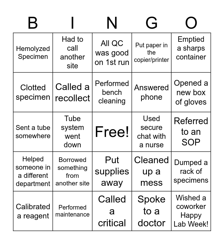 This bingo card has a free space and 29 words: Calibrated a reagent, Switched Lots, Tube system went down, Restocked Supplies, Hemolyzed Specimen, All QC was good on 1st run, Called a recollect, Borrowed something from another site, Used secure chat with a nurse, Performed maintenance, Referred to an SOP, Wished a coworker Happy Lab Week!, Called a critical, Spoke to a doctor, Opened a new box of gloves, Ran the centrifuge, Put supplies away, Helped someone in a different department, Emptied a sharps container, Sent a tube somewhere, Cleaned up a mess, Had a QC outlier, Answered phone, Clotted specimen, Put paper in the copier/printer, Had to call another site, Dumped a rack of specimens, Performed bench cleaning and Called a courier.