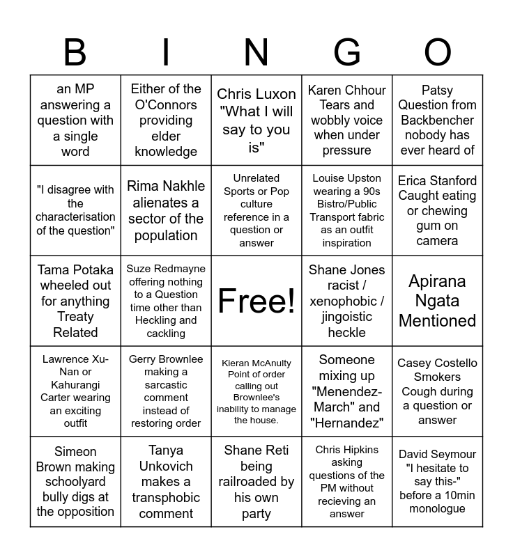 This bingo card has a free space and 44 words: Winny's Brainworm makes an unrelated Point of order, David Seymour "I hesitate to say this-" before a 10min monologue, Chloe Swarbrick threatened to be ejected for heckling., Simeon Brown making schoolyard bully digs at the opposition, Debbie Ngarewa - Packer or Rawiri Waititi highlighting the plight of Maori & Pasifika people at the hands of the government, Chris Hipkins asking questions of the PM without recieving an answer, Chris Luxon "What I will say to you is", Nicola Willis condescending personal attack, Patsy Question from Backbencher nobody has ever heard of, Tanya Unkovich makes a transphobic comment, Karen Chhour Tears and wobbly voice when under pressure, Shane Jones racist / xenophobic / jingoistic heckle, Kieran McAnulty Point of order calling out Brownlee's inability to manage the house., Gerry Brownlee making a sarcastic comment instead of restoring order, Ricardo Menendez - March being shouted down for reasons unrelated to his question, Shane Reti being railroaded by his own party, Gerry Brownlee getting someones name wrong, Tama Potaka wheeled out for anything Treaty Related, Tākuta Ferris making a comment and refusing to withdraw and apologize, Erica Stanford Caught eating or chewing gum on camera, Either of the O'Connors providing elder knowledge, Ayesha Verrall gradually raising her voice over the course of a question, Mark Mitchell reading an entire answer to a question off the paper in front of him, an MP answering a question with a single word, Cheerleading heckles from either side of the house, Apirana Ngata Mentioned, Chris Bishop having an ill fitting suit, The Speaker of the house having to remind members to be quiet on their exit from the house, Someone mixing up "Menendez-March" and "Hernandez", Lawrence Xu-Nan or Kahurangi Carter wearing an exciting outfit, Tākuta Ferris or Takutai Moana Kemp names mixed up, Casey Costello Smokers Cough during a question or answer, Brooke van Velden gives an entire question or answer without changing her expression or tone of voice, Judith Collins showing visible disagreement with the actions of someone on her side of the house., Suze Redmayne offering nothing to a Question time other than Heckling and cackling, Louise Upston mashing the invisible button on her desk while asking or answering a question, A member being caught very obviously being on their phone, Chris Bishop P-O-O shot down by the Speaker, Unrelated Sports or Pop culture reference in a question or answer, "I disagree with the characterisation of the question", Louise Upston wearing a 90s Bistro/Public Transport fabric as an outfit inspiration, A male MP wearing a floral patterned tie, Rima Nakhle alienates a sector of the population and Minister answering questions on behalf of another minister throwing them under the bus.