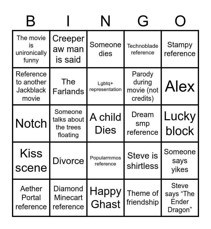 This bingo card has a free space and 45 words: Together We are Minecraft!, Steve says “The Ender Dragon”, This is just like (Video Game), Aether Portal reference, I hate Video Games person, Theme of friendship, Someone dies, Totem of Undying, Stampy reference, Diamond Minecart reference, Technoblade reference, Dream smp reference, Popularmmos reference, Divorce, Netherite, Happy Ghast, Minecraft storymode referece, Notch, Herobrine, Alex, Creeper aw man is said, Parody song plays, Minecon capes, The movie is unironically funny, Ssundee reference, Lucky block, Other minecraft games mentioned, Someones named Aiden, Steve is shirtless, Kiss scene, Uhm.. That just happened…, Someone says yikes, Someone other than steve sings, Mob vote mobs are mentioned, Someone becomes evil, Someone talks about the trees floating, Political reference or statement, Steve says skidoosh, Steve Dies, Lgbtq+ representation, Reference to another Jackblack movie, Parody during movie (not credits), Bedrock, The Farlands and Jace is in the movie for some reason.