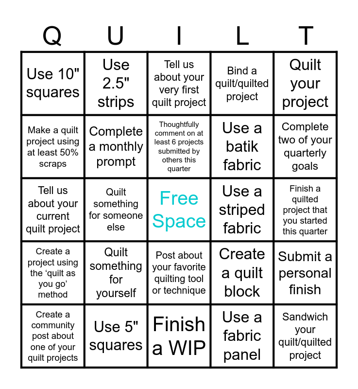 This bingo card has a free space and 28 words: Submit a personal finish, Share one of your favorite quilt patterns, Use a batik fabric, Use a fabric panel, Make a quilt project using at least 50% scraps, Tell us about your very first quilt project, Use 2.5" strips, Create a project using the ‘quilt as you go’ method, Use a striped fabric, Create a community post about one of your quilt projects, Tell us about your current quilt project, Bind a quilt/quilted project, Use 5" squares, Finish a WIP, Complete two of your quarterly goals, Complete the quarterly challenge, Quilt something for yourself, Complete a monthly prompt, Thoughtfully comment on at least 6 projects submitted by others this quarter, Post about your favorite quilting tool or technique, Use 10" squares, Use a fat quarter, Sandwich your quilt/quilted project, Quilt something for someone else, Finish a quilted project that you started this quarter, Create a quilt block, Quilt your project and Use your seam ripper.