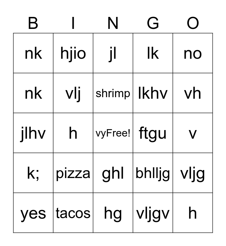 This bingo card has a free space and 24 words: pizza, tacos, shrimp, yes, no, nk, nk, hjio, ftgu, ghl, lkhv, jlhv, bhlljg, vljg, vlj, vljgv, v, jl, vh, h, h, k;, lk and hg.