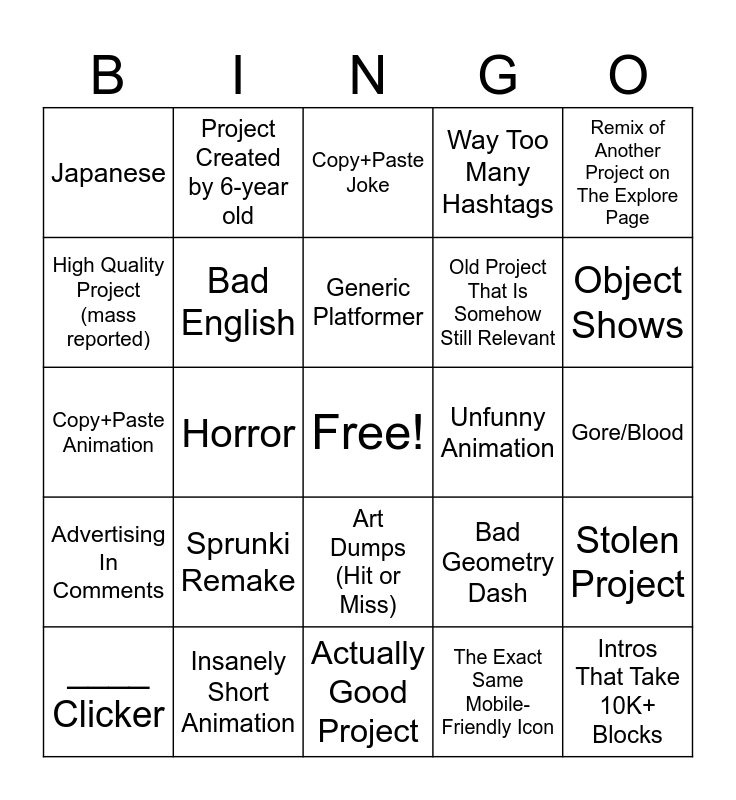 This bingo card has a free space and 24 words: Sprunki Remake, Insanely Short Animation, Generic Platformer, ____ Clicker, Remix of Another Project on The Explore Page, Japanese, High Quality Project (mass reported), Project Created by 6-year old, Unfunny Animation, Art Dumps (Hit or Miss), Old Project That Is Somehow Still Relevant, Copy+Paste Animation, Bad Geometry Dash, Stolen Project, Bad English, The Exact Same Mobile-Friendly Icon, Gore/Blood, Copy+Paste Joke, Object Shows, Horror, Intros That Take 10K+ Blocks, Advertising In Comments, Way Too Many Hashtags and Actually Good Project.