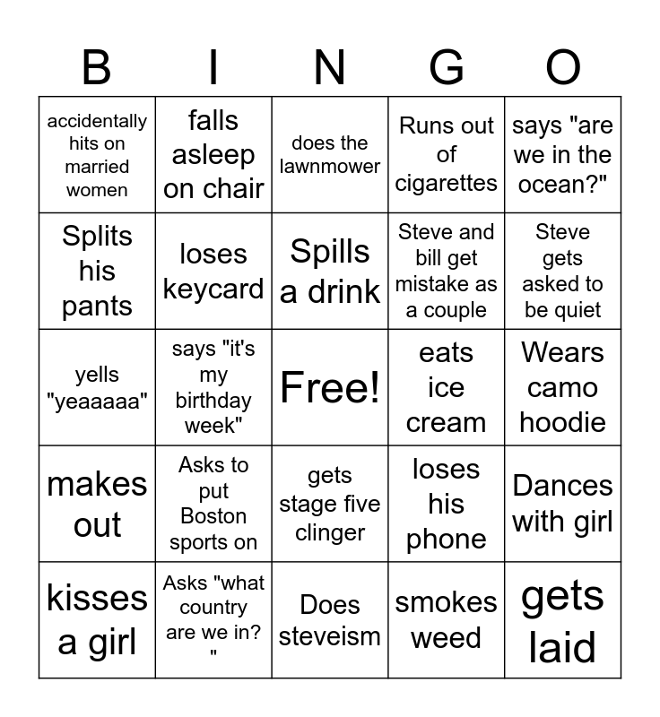 This bingo card has a free space and 24 words: kisses a girl, Asks to put Boston sports on, Spills a drink, smokes weed, says "are we in the ocean?", accidentally hits on married women, falls asleep on chair, does the lawnmower, eats ice cream, Wears camo hoodie, yells "yeaaaaa", loses keycard, loses his phone, Dances with girl, Splits his pants, Asks "what country are we in? ", Does steveism, Runs out of cigarettes, Steve gets asked to be quiet, makes out, says "it's my birthday week", gets stage five clinger, Steve and bill get mistake as a couple and gets laid.