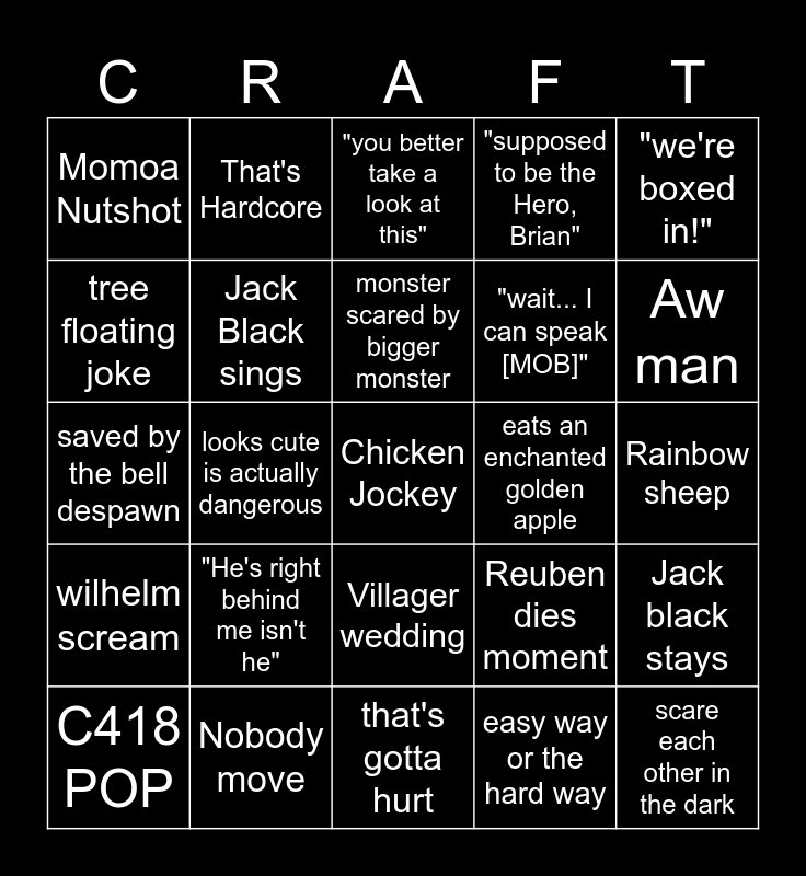 This bingo card has a free space and 24 words: C418 POP, "He's right behind me isn't he", monster scared by bigger monster, easy way or the hard way, "we're boxed in!", Momoa Nutshot, That's Hardcore, "you better take a look at this", eats an enchanted golden apple, Rainbow sheep, saved by the bell despawn, Jack Black sings, Reuben dies moment, Jack black stays, tree floating joke, Nobody move, that's gotta hurt, "supposed to be the Hero, Brian", Aw man, wilhelm scream, looks cute is actually dangerous, Villager wedding, "wait... I can speak [MOB]" and scare each other in the dark.