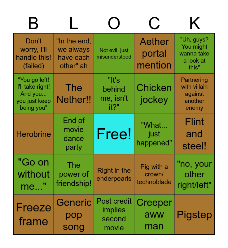 This bingo card has a free space and 24 words: The power of friendship!, Generic pop song, "It's behind me, isn't it?", Freeze frame, "Uh, guys? You might wanna take a look at this", Don't worry, I'll handle this! (failed), "You go left! I'll take right! And you... you just keep being you", "In the end, we always have each other" ah, "What... just happened", Right in the enderpearls, Chicken jockey, Herobrine, Pig with a crown/ technoblade, "no, your other right/left", The Nether!!, Creeper aww man, Flint and steel!, Not evil, just misunderstood, Partnering with villain against another enemy, End of movie dance party, Pigstep, "Go on without me...", Aether portal mention and Post credit implies second movie.