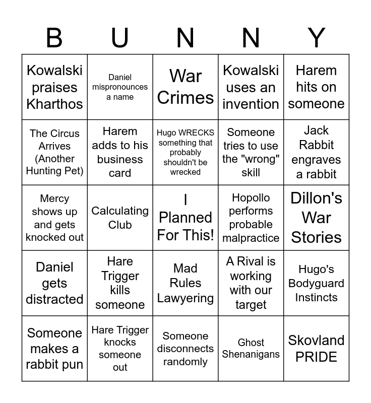 This bingo card has a free space and 24 words: Hare Trigger kills someone, Hare Trigger knocks someone out, Hugo WRECKS something that probably shouldn't be wrecked, Someone makes a rabbit pun, Harem hits on someone, Kowalski praises Kharthos, The Circus Arrives (Another Hunting Pet), Daniel mispronounces a name, Hopollo performs probable malpractice, Mad Rules Lawyering, Someone tries to use the "wrong" skill, Mercy shows up and gets knocked out, A Rival is working with our target, Hugo's Bodyguard Instincts, Harem adds to his business card, Ghost Shenanigans, Dillon's War Stories, War Crimes, Jack Rabbit engraves a rabbit, Calculating Club, Skovland PRIDE, Daniel gets distracted, Kowalski uses an invention and Someone disconnects randomly.