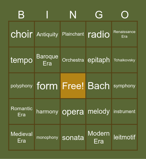 This bingo card has a free space and 34 words: What is music for?, Modern Era, Jazz, Classical Era, Romantic Era, Baroque Era, Renaissance Era, Medieval Era, Antiquity, Piano, Orchestra, Plainchant, Beethoven, Mozart, Bach, Tchaikovsky, monophony, polyphony, harmony, melody, opera, string quartet, choir, symphony, sonata, leitmotif, radio, madrigal, epitaph, tempo, rhythm, form, instrument and dynamics.