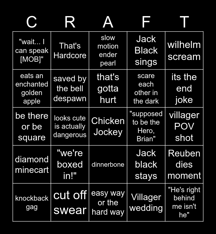 This bingo card has a free space and 49 words: C418, "He's right behind me isn't he", monster scared by bigger monster, easy way or the hard way, "we're boxed in!", Momoa Nutshot, That's Hardcore, "you better take a look at this", eats an enchanted golden apple, Rainbow sheep, saved by the bell despawn, Jack Black sings, Reuben dies moment, Jack black stays, tree floating joke, Nobody move, that's gotta hurt, "supposed to be the Hero, Brian", Aw man, wilhelm scream, looks cute is actually dangerous, Villager wedding, "wait... I can speak [MOB]", scare each other in the dark, Terraria reference, its the end joke, knockback gag, spider jockey, dinnerbone, diamond minecart, Fart joke, "___ is my middle name!", kill circle, let's kick it up a notch, cut off swear, TNT cannon, alex reference/cameo, ender dragon, villager POV shot, tool breaks at worst time, Flint and steel, deus ex machina, "we have to work togetherrr!", thrown egg spawns chicken, be there or be square, slow motion ender pearl, zoom out on cube planet, curse of binding and never dig straight down.