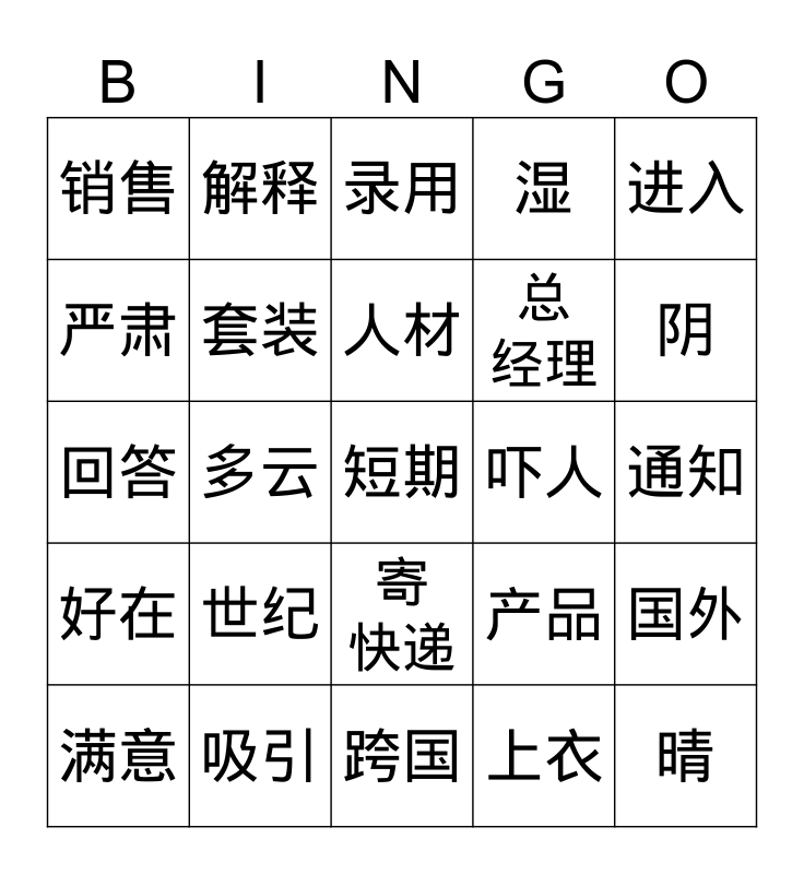This bingo card has a free space and 24 words: 世纪, 吸引, 人材, 满意, 进入, 销售, 严肃, 解释, 吓人, 寄 快递, 总 经理, 回答, 产品, 国外, 套装, 上衣, 通知, 录用, 阴, 多云, 晴, 好在, 湿 and 跨国.