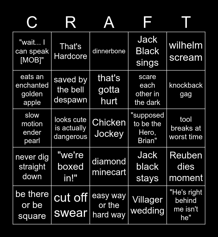 This bingo card has a free space and 50 words: C418, "He's right behind me isn't he", monster scared by bigger monster, easy way or the hard way, "we're boxed in!", Momoa Nutshot, That's Hardcore, "you better take a look at this", eats an enchanted golden apple, Rainbow sheep, saved by the bell despawn, Jack Black sings, Reuben dies moment, Jack black stays, tree floating joke, Nobody move, that's gotta hurt, "supposed to be the Hero, Brian", Aw man, wilhelm scream, looks cute is actually dangerous, Villager wedding, "wait... I can speak [MOB]", scare each other in the dark, Terraria reference, its the end joke, knockback gag, spider jockey, dinnerbone, diamond minecart, Fart joke, "___ is my middle name!", kill circle, let's kick it up a notch, cut off swear, TNT cannon, alex reference/cameo, ender dragon, villager POV shot, tool breaks at worst time, Flint and steel, deus ex machina, "we have to work togetherrr!", thrown egg spawns chicken, be there or be square, slow motion ender pearl, zoom out on cube planet, curse of binding, never dig straight down and villager news.