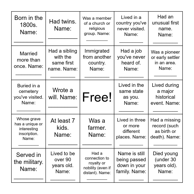 This bingo card has a free space and 24 words: At least 7 kids. Name: _________, Lived to be over 90 years old. Name: _________, Immigrated from another country. Name: _________, Served in the military. Name: _________, Had an unusual first name. Name: _________, Born in the 1800s. Name: _________, Married more than once. Name: _________, Had twins. Name: _________, Lived in the same state as you. Name: _________, Was a farmer. Name: _________, Had a job you've never heard of. Name: _________, Buried in a cemetery you've visited. Name: _________, Lived in three or more different places. Name: _________, Had a missing record (such as birth or death). Name: _________, Had a sibling with the same first name. Name: _________, Name is still being passed down in your family. Name: _________, Lived during a major historical event. Name: _________, Was a member of a church or religious group. Name: _________, Was a pioneer or early settler in an area. Name: _________, Wrote a will. Name: _________, Died young (under 30 years old). Name: _________, Whose grave has a unique or interesting inscription. Name: _________, Lived in a country you've never visited. Name: _________ and Had a connection to royalty or nobility (even if distant). Name: _________.