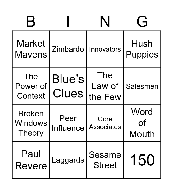 This bingo card has 38 words: Free!, The Tipping Point, Malcolm Gladwell, The Law of the Few, Connectors, Mavens, Salesmen, The Stickiness Factor, The Power of Context, Broken Windows Theory, Word of Mouth, Hush Puppies, Paul Revere, Sesame Street, Blue’s Clues, 150, Six Degrees of Separation, Innovators, Late Majority, Laggards, Market Mavens, The Chasm, Peer Influence, Weak Ties, 80/20 Principle, Baltimore, Roger Horchow, Mark Alpert, Tom Gau, Ronald Reagan, Affective Communication Test, Clutter problem, New York City, Zimbardo, Fundamental Attribution Error, Channel Capacity, Gore Associates and Airwalk.