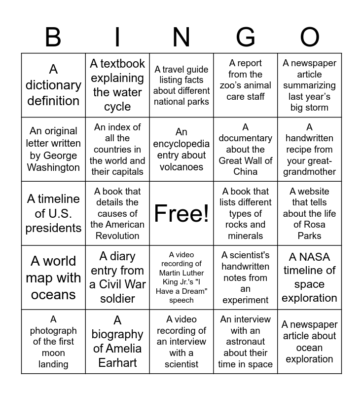 This bingo card has a free space and 24 words: A diary entry from a Civil War soldier, A biography of Amelia Earhart, An encyclopedia entry about volcanoes, A photograph of the first moon landing, A newspaper article summarizing last year’s big storm, A dictionary definition, An original letter written by George Washington, A textbook explaining the water cycle, A book that lists different types of rocks and minerals, A video recording of Martin Luther King Jr.'s "I Have a Dream" speech, A documentary about the Great Wall of China, A timeline of U.S. presidents, A scientist's handwritten notes from an experiment, A NASA timeline of space exploration, An index of all the countries in the world and their capitals, An interview with an astronaut about their time in space, A website that tells about the life of Rosa Parks, A travel guide listing facts about different national parks, A handwritten recipe from your great-grandmother, A book that details the causes of the American Revolution, A newspaper article about ocean exploration, A world map with oceans, A report from the zoo’s animal care staff and A video recording of an interview with a scientist.
