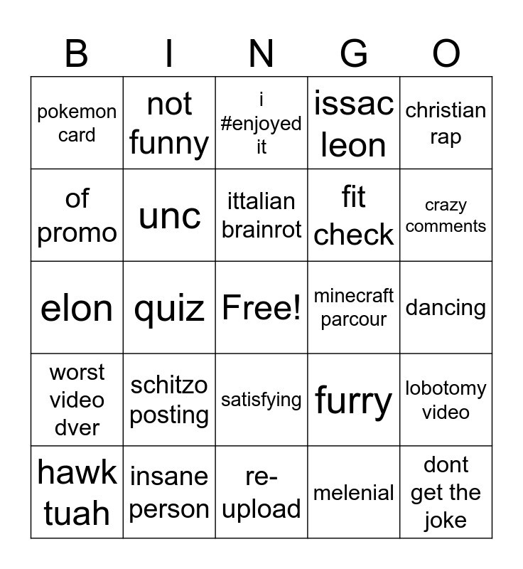This bingo card has a free space and 24 words: schitzo posting, insane person, ittalian brainrot, hawk tuah, christian rap, pokemon card, of promo, not funny, minecraft parcour, satisfying, fit check, elon, furry, lobotomy video, unc, melenial, dancing, i #enjoyed it, crazy comments, quiz, dont get the joke, worst video dver, issac leon and re-upload.