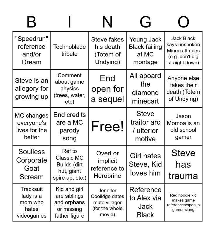 This bingo card has a free space and 29 words: Tracksuit lady is a mom who hates videogames, Jason Momoa plot twist villain, End credits are a MC parody song, Girl takes a while to warm up to MC world, "Speedrun" reference and/or Dream, Steve fakes his death (Totem of Undying), Comment about game physics (trees, water, etc), Ref to Classic MC Builds (dirt hut, giant spire up, etc.), Steve traitor arc / ulterior motive, Kid and girl are siblings and orphans or missing father figure, Jason Momoa is an old school gamer, Red hoodie kid makes game references/speaks gamer slang, Jennifer Coolidge dates mute villager (for the whole movie), Reference to Alex via Jack Black, Anyone else fakes their death (Totem of Undying), Ender Dragon mentioned and/or teased for sequel, Overt or implicit reference to Herobrine, Soulless Corporate Goat Scream, Jack Black says unspoken Minecraft rules (e.g. don't dig straight down), MC changes everyone's lives for the better, Girl hates Steve, Kid loves him, MCYT references and/or appearances, All aboard the diamond minecart, Steve is an allegory for growing up, Young Jack Black failing at MC montage, Technoblade tribute, Steve has trauma, End open for a sequel and Jason Momoa old school gamer vs kid new gamer.