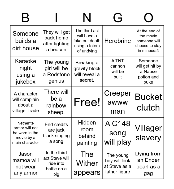 This bingo card has a free space and 24 words: End credits are jack black singing a song, In the third act Steve will ride into battle on a pig, Breaking a gravity block will reveal a secret., Jason mamoa will not wear any armor, At the end of the movie someone will choose to stay in minecraft, Someone builds a dirt house, Karaoke night using a jukebox, They will get back home after lighting a beacon, Creeper awww man, Hidden room behind painting, A TNT cannon will be built, A character will complain about a villager trade, A C148 song will play, Villager slavery, The young girl will be a Redstone genius, The young boy will look at Steve as a father figure, Bucket clutch, The third act will have a fake out death using a totem of undying, Someone will get hit by a Nause potion and puke, There will be a rainbow sheep., Dying from an Ender pearl as a gag, Netherite armor will not be worn in the movie by a main character, Herobrine and The Wither appears.