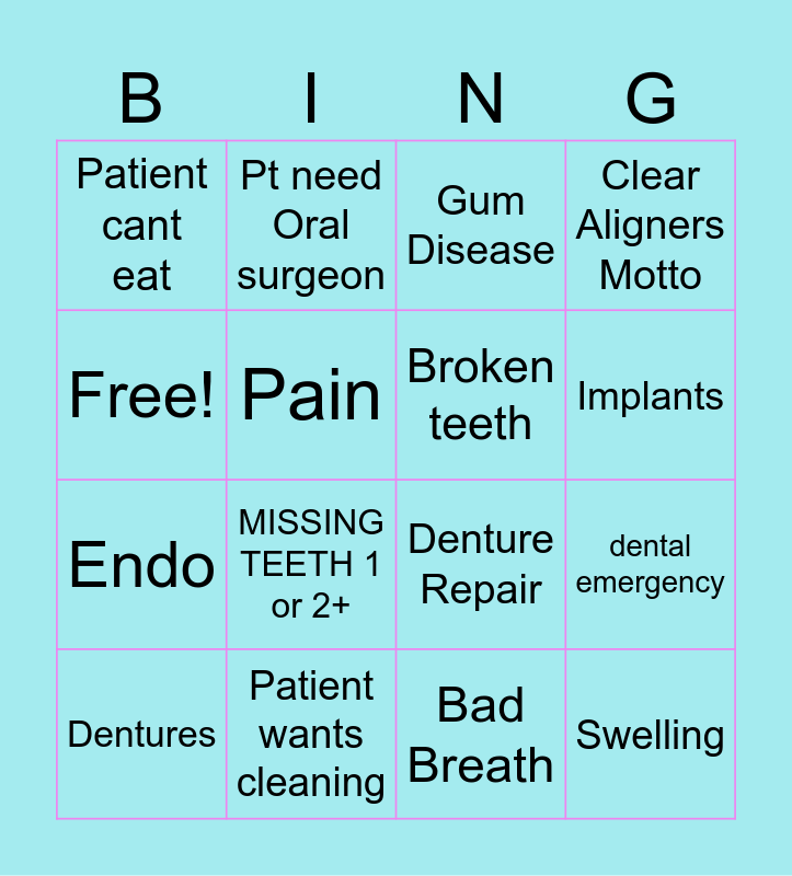 This bingo card has 16 words: Patient wants cleaning, dental emergency, Gum Disease, Patient cant eat, Endo, Pt need Oral surgeon, Denture Repair, Bad Breath, Free!, Pain, Dentures, Clear Aligners Motto, MISSING TEETH 1 or 2+, Implants, Broken teeth and Swelling.