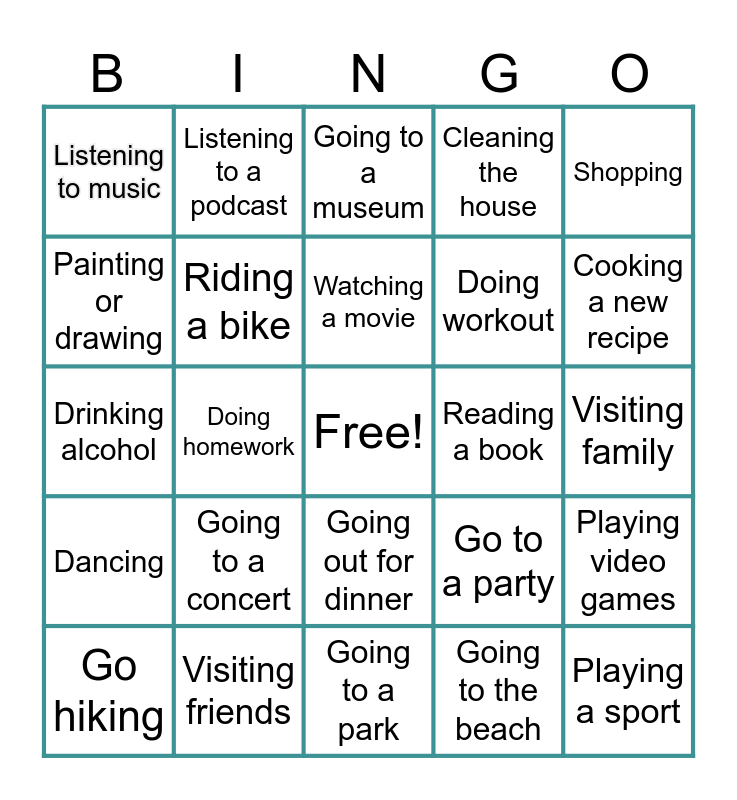 This bingo card has a free space and 24 words: Go hiking, Going to a concert, Watching a movie, Going to the beach, Shopping, Listening to music, Listening to a podcast, Going to a museum, Reading a book, Visiting family, Drinking alcohol, Riding a bike, Go to a party, Playing video games, Painting or drawing, Visiting friends, Going to a park, Cleaning the house, Cooking a new recipe, Dancing, Doing homework, Going out for dinner, Doing workout and Playing a sport.