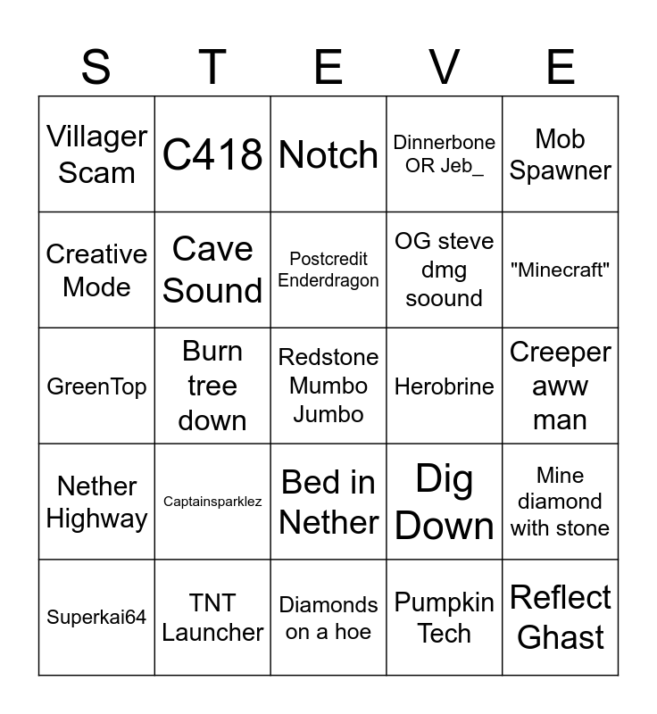 This bingo card has 25 words: Captainsparklez, Diamonds on a hoe, Postcredit Enderdragon, Superkai64, Mob Spawner, Villager Scam, Creative Mode, C418, Herobrine, Bed in Nether, OG steve dmg soound, GreenTop, Dig Down, Mine diamond with stone, Cave Sound, Reflect Ghast, Creeper aww man, Notch, "Minecraft", Burn tree down, Redstone Mumbo Jumbo, TNT Launcher, Nether Highway, Dinnerbone OR Jeb_ and Pumpkin Tech.
