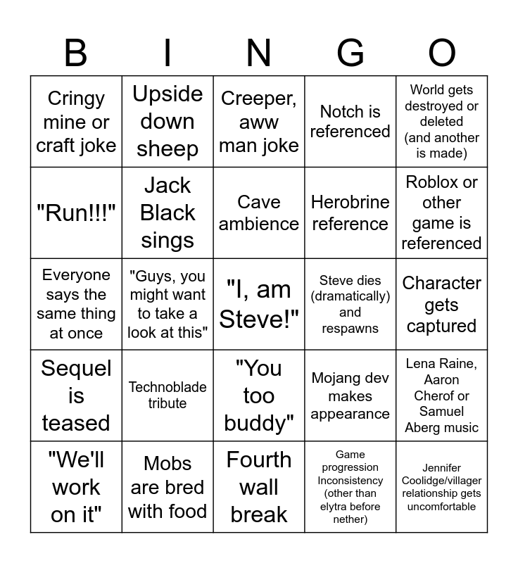 This bingo card has a free space and 29 words: "We'll work on it", Minecraft celebrity makes appearance, "Guys, you might want to take a look at this", Item or block is featured that isn't in the game, Cringy mine or craft joke, Creeper, aww man joke, Jack Black sings, Technoblade tribute, Steve dies (dramatically) and respawns, Mobs are bred with food, Character gets captured, Jennifer Coolidge/villager relationship gets uncomfortable, Fourth wall break, Game progression Inconsistency (other than elytra before nether), Roblox or other game is referenced, Alex appears, "You too buddy", Sequel is teased, World gets destroyed or deleted (and another is made), Everyone says the same thing at once, Mojang dev makes appearance, "What is this place?"/"Where are we?", Herobrine reference, "Run!!!", Notch is referenced, Upside down sheep, Lena Raine, Aaron Cherof or Samuel Aberg music, Cave ambience and Scary part.