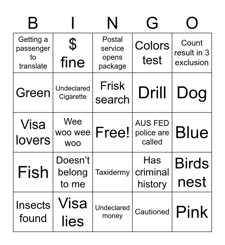 This bingo card has a free space and 37 words: Blame family member, No drugs found, Drugs found, Undeclared Cigarette, Birds nest, Doesn’t belong to me, Frisk search, Prosecuted / or Could result in court, Count result in 3 exclusion, I didn’t fill out the card, Wee woo wee woo, Colors test, Pink, Blue, Green, Fish, Try to eat the food, Postal service opens package, Taxidermy, AUS FED police are called, Getting a passenger to translate, Dog, Insects found, Undeclared money, Undeclared Seeds, Cautioned, $ fine, Cries, Towel, Text messages, Canceled visa, Visa lies, Visa lovers, “It’s not food”, Has criminal history, Drill and Concealment.